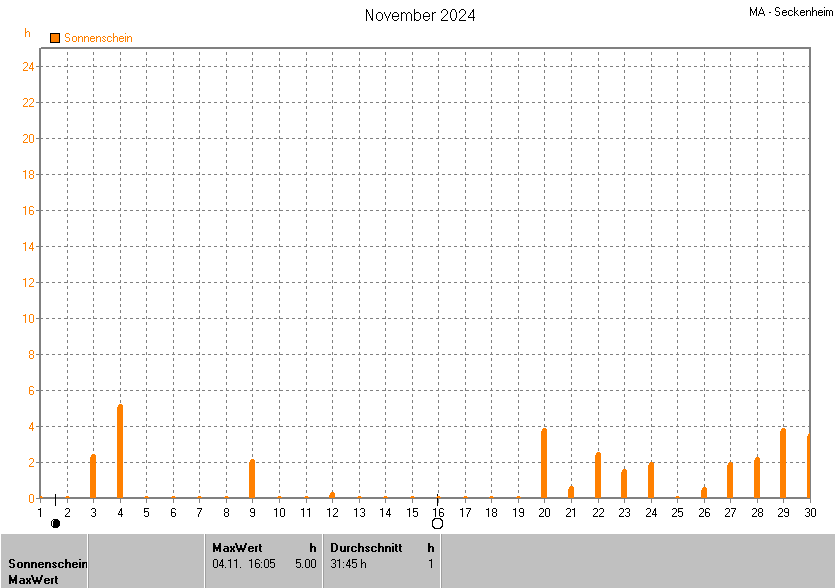 Dargestellt wird die grafische Übersicht für die Sonnenscheinzeit. Zu sehen sind immer die täglichen Sonnenstunden (von 0-24 Uhr):