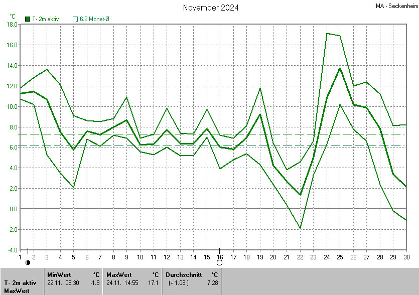Der wärmste Tag war der 24.11.2024 um 14:55 mit 17.1°C. Am kältesten war es mit -1.9°C am 22.11.2024 um 06:30.
