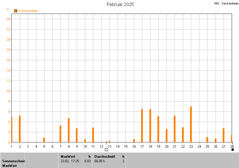 Dargestellt wird die grafische Übersicht für die Sonnenscheinzeit. Zu sehen sind immer die täglichen Sonnenstunden (von 0-24 Uhr):