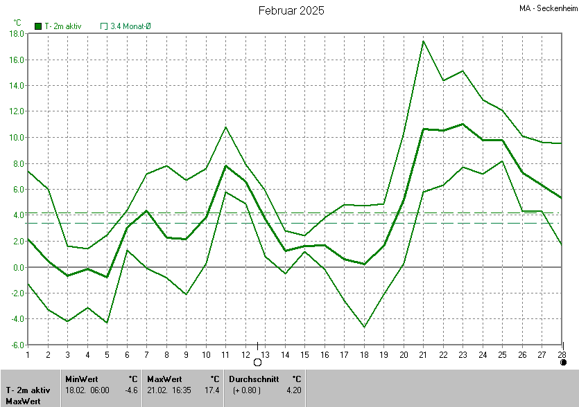 Der wärmste Tag war der 21.02.2025 um 16:35 mit 17.4°C. Am kältesten war es mit -4.6°C am 18.02.2025 um 06:00.