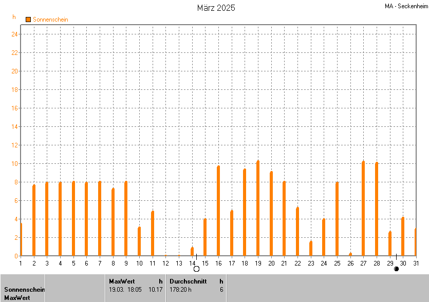 Dargestellt wird die grafische Übersicht für die Sonnenscheinzeit. Zu sehen sind immer die täglichen Sonnenstunden (von 0-24 Uhr):