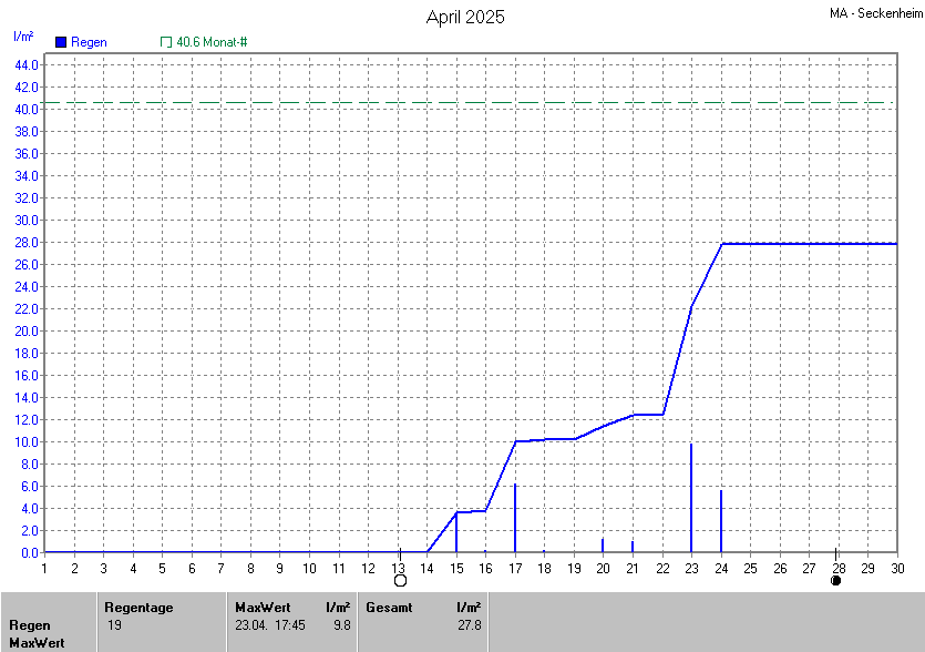 Die gesamte Regenmenge lag bei 27.8l/m² (entspricht: 68.5%) und war damit um -12.8l/m² vom langjährigen Wert entfernt. Niederschlag gab es an 8Tagen. Mehr als 2mm Regen gab es an 4Tagen. Sehr viel Regen mit mehr als 20mm pro Tag gab es an 0Tagen.