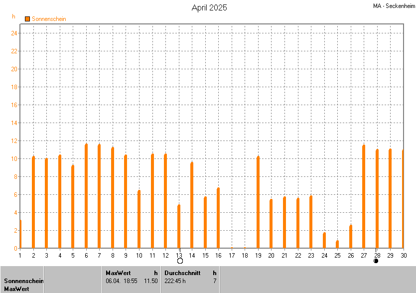 Dargestellt wird die grafische Übersicht für die Sonnenscheinzeit. Zu sehen sind immer die täglichen Sonnenstunden (von 0-24 Uhr):