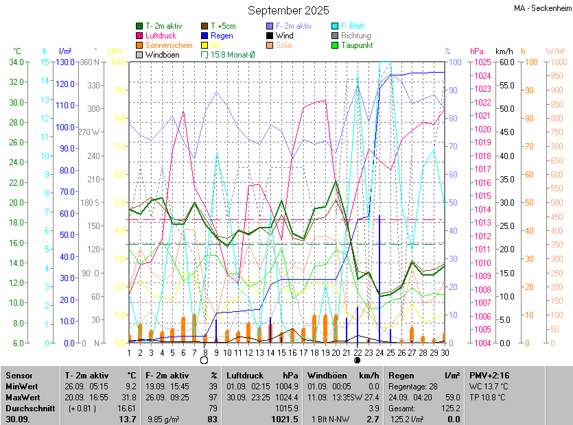 Die Durchschnittstemperatur für den Monat September 2025 lag bei 16.62°C. Die Abweichung vom langjährigen Mittel war +0.82°C.
