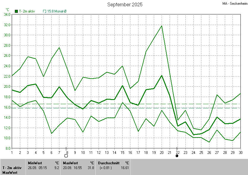 Der wärmste Tag war der 20.09.2025 um 16:55 mit 31.8°C. Am kältesten war es mit 9.2°C am 26.09.2025 um 05:15.