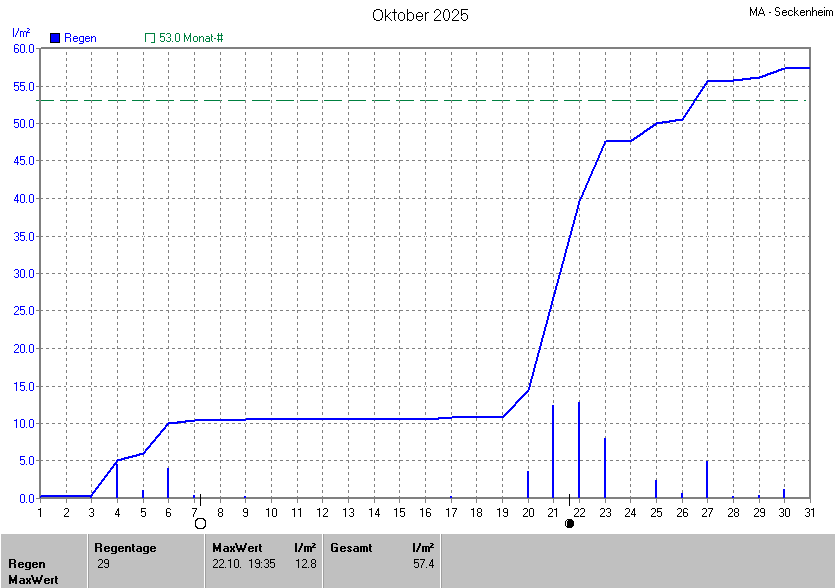 Die gesamte Regenmenge lag bei 57.4l/m² (entspricht: 108.3%) und war damit um +4.4l/m² vom langjährigen Wert entfernt. Niederschlag gab es an 18Tagen. Mehr als 2mm Regen gab es an 8Tagen. Sehr viel Regen mit mehr als 20mm pro Tag gab es an 0Tagen.