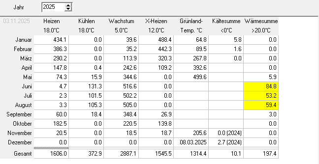 Berechnung: Liegt der Temperatur-Mittelwert des Tages über dem einstellbaren Basiswert (18°C) wird die Differenz vom aktuellen Mittelwert zum Basiswert zu den Kühlengradtagen addiert.